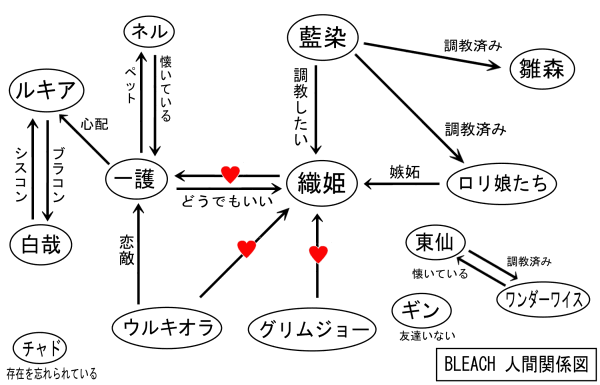 2007/4/26ジャンプ感想(2007年21号) ジャンプゲーム情報 DS用ソフト『BLACK CAT』の新規描きおろしキャラにレッドXIIIがいたことに思いきり噴き出してしまいました。こういうのを見るとやっぱり矢吹先生だなあと思ってしまいます。思えば『もて王』以前にジャンプでパロネタを確立させた漫画でしたね。 To LOVE る(巻頭カラー) スカートのなかにいる!(Wizardry) BLEACH 全然一護を殺す気のないウルキオラ。ノイトラといい、十刃の人たちはチョコラテがどうのと説教されそうな人ばかりですが、ウルキオラは確か一護がもっと強くなったら味方に引き入れようとか言っていたんでしたっけ。強さ云々はおいといても、味方に引き入れるには交渉以前から最悪の関係になっているんですが、どうやって口説くつもりなんでしょう。織姫の救出に来たはずなのに目的が打倒十刃になっている一護のことです、織姫が破面側にいるということは交渉において何のアドバンテージにもならないはずです。下手すれば織姫もついでに殺してから帰還しかねません。 そして一方、ある意味引きこもりニートな生活を送っている織姫はというと、”ロリ娘に虐待されていました”。字面だけ見ればその手の趣味の人にはたまらないシチュエーションになることでしょうが、織姫がノリ気でないので普通の虐待になっています。でもロリ娘の方は血まみれの織姫の顔を見て顔を紅潮させてかなり興奮しています。 前作『ZOMBIEPOWDER』でもショタキャラが若い女性を拷問して指を切断するシーンを描いていた久保先生ですが、虐待・陵辱系のシチュエーションを描かせたら少年ジャンプにおいても上位に入ることでしょう。 それにしてもこの後どうなってしまうのか心配でなりません。ええ、もちろんロリ娘ともう一人の地味な子(名前忘れた)の方がです。織姫の方は、痛いのはともかくケガなんて彼女の回復魔法ですぐに治せます。しかしロリ娘たちの方は、万が一、織姫に片思い中のウルキオラにでも見つかろうものなら即座に八つ裂きにされかねないし、藍染様にでもバレれば「お仕置き」と称して今度は彼女たちがどんな虐待と(主に)陵辱を受けるか分かったものじゃありません。特に藍染様の考えることですからノーマルな行為には及ばないはずです。彼女たちは今自分たちがどんだけ危険な命の綱渡りをしているのか気付いていません。 そして織姫の虐待に割って入ったのはウルキオラ……ならぬグリムジョーでした。これは意外な展開です。 正直、なんでグリムジョー?ということに気を取られて、彼が鍵はすでに開いているはずのドアを無駄にド派手に吹き飛ばして入ってきたことなどどうでもよくなってしまいました(内側には鍵穴も何も付いていないから外側からしか施錠できないはず)。 しかもなんか助けに来たっぽい雰囲気を醸し出しています。この人が織姫を助けに来る理由が何も思いつかないのですが、腕と腹の傷を治してくれたことに恩を感じるうちに恋にまで発展してしまったのでしょうか。 藍染様からはお気に入りにされて、お気に入りの座を奪われた女たちからは妬まれて、ウルキオラとグリムジョーからは片思いされて、その当の織姫はというと一護のことしか頭になくって、でもその一護は織姫のことはすでに眼中になく今となってはついでに始末されそうな勢いだし。どこぞの少女漫画よりもはるかにドロドロとした展開になってきました。そんなふうにどうにも『BLEACH』の人間(死神、虚)関係が複雑になってきたので、ここで図にまとめてみました。 ![]() ここで分かるのは、もし今後、雛森が戦線復帰するようなことがあれば、織姫は今度は雛森から命を狙われることになるということです。 さて、阿散井対ザエルアポロの戦いの方はというと、阿散井は始解のまま相手にろくに傷を付けられずにいました。 ザエルアポロ「飽きた、と言ったんだ。言葉も解らなくなったのか?失礼を承知で百も言うが、正直、もう見るべき所が無いんだ」 阿散井との戦闘前に必死こいてデータ収集をして卍解を封じるようにセッティングまでしていた彼が一体何を言っているのか、阿散井でなくても彼の言葉の意味が解りませんが、どうやらそろそろ止めを刺したいらしいです。 ザエルアポロ「ともかく君は最早、僕が直接手を下すには値しないという事さ」 阿散井との戦闘前に必死こいてデータ収集をして卍解を封じるようにセッティングまでしていた彼が一体何を言っているのか、阿散井でなくても彼の言葉の意味が解りませんが、どうやらそろそろ止めを刺したいらしいです。 NARUTO 「…お…お前らは一体…何が目的で…ここへ来た?」 水月「重吾を連れ出しに来ただけだけど…仲間にしたくてね」 水月たちにボコられた彼らにしてみれば、大蛇丸が死に、看守も全員倒して、やっと自由の身だと思っていたところにボコボコにされて、理由を聞いてみれば用があるの重吾だけで俺たち関係ねーじゃんかといい迷惑な気分になっていると